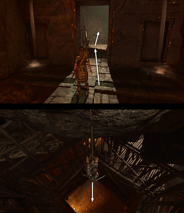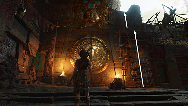 Lara turns the huge wheel to open the gate so Unuratu and her companions can enter. Lara then makes her way to the inner gate and uses the serpent key to open it. Unuratu and Uchu emerge from a side area with Etzli just as the cultists realize their stronghold has been breached. As the cult members move in on the rebels, Unuratu orders Uchu to take Etzli to safety. She allows herself to be surrounded and captured in order to draw attention away from her son and from Lara, who sneaks through the inner gate.