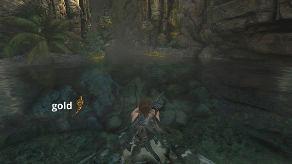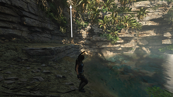 LARGE POOL SOUTHEAST OF THE MISSION: After completing the TREE OF LIFE CHALLENGE TOMB, you emerge near the Deserted Cloister Base Camp. If your inventory is getting full, you can return to the Mission (or Fast Travel to Kuwaq Yaku or Paititi) to sell off some resources. Then return here and head back down the steps to the east into the EMPRESS JAGUAR'S HUNTING GROUND. Lara will probably crouch as though there's danger, but if you just defeated the leopard before entering the tomb, it should be safe to pass through this area. Exit through the small opening in the rocks at the east side of the arena. (screenshots)