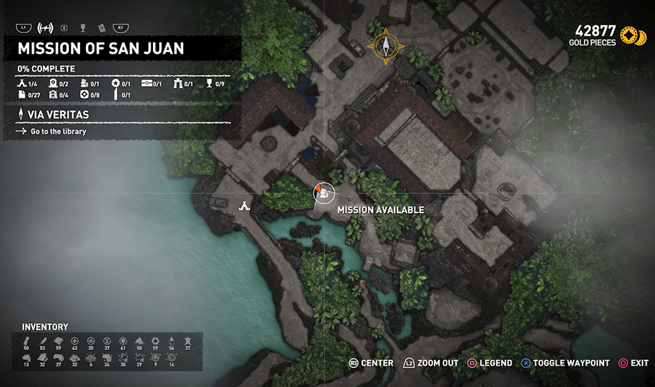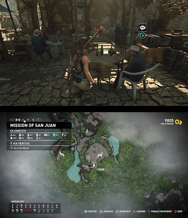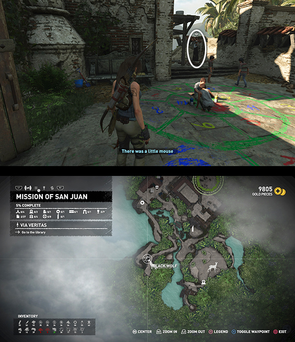 IMPORTANT: Exploring the Library advances the story and takes Lara away from the San Juan Mission. For specifics, skip down to the LIBRARY section, below. You'll be able to return to the Mission later via Fast Travel, but there's a lot you could do before this. I recommend waiting until you've covered most of the level before approaching Jonah.