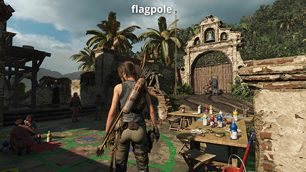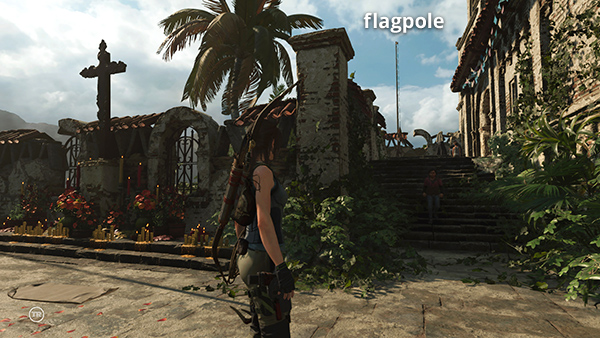 The first flagpole (1/5) for the Raise the Flags Challenge is just beyond where Sara and Guillermo are standing. Cut the release pulley with your knife to raise the flag and initiate the challenge. The locations of the other flagpoles are noted below and marked with red dots on the annotated level map.