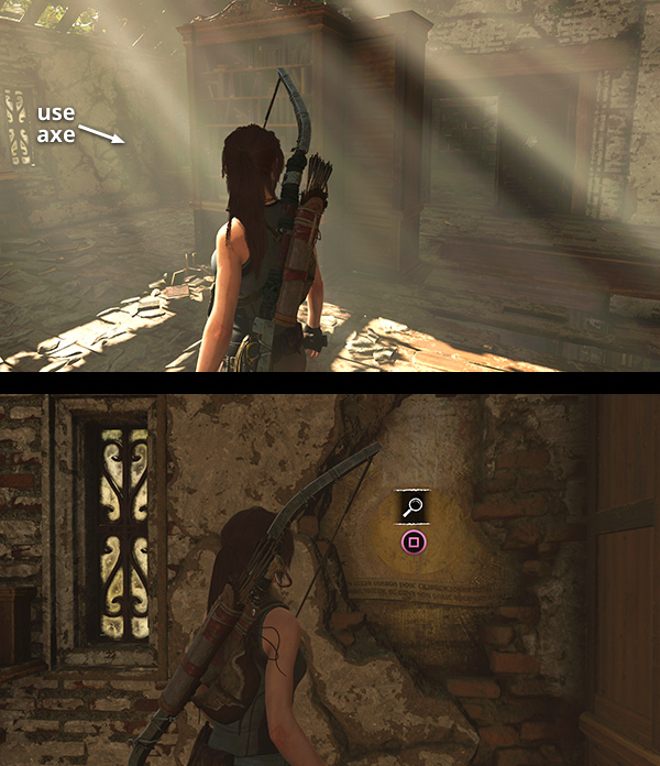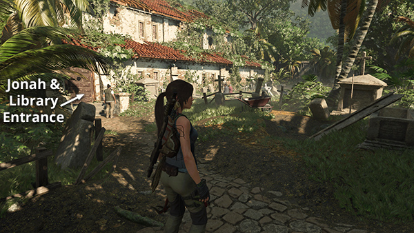 When you're ready to move on with the main story, head for the archway at the northeast end of the COURTYARD. Proceed into the GRAVEYARD to find Jonah standing near the entrance to the LIBRARY. (screenshot) The library and graveyard are marked on the annotated level map, but you can also activate Survival Instinct and follow the objective beacon.) When you approach Jonah, he and Lara enter the library.