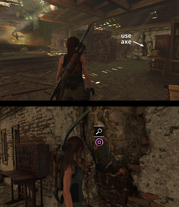IMPORTANT: Once you locate the cross and enter the basement, you won't be able to return to the Mission exterior until you've completed the level and and reached the next base camp. Before the end of the level you'll also have to get through a series of combat encounters. So if you have gold or skill points to spend, need to stock up on ammo and supplies, or just want to finish exploring the Mission, leave now and return when you're ready to move on.