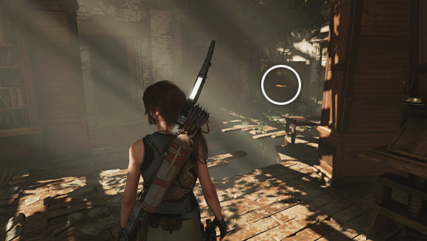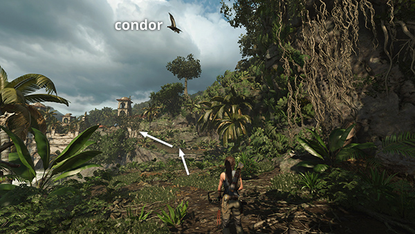 Around the right side of the bell tower is a ledge overlooking the EMPRESS JAGUAR'S HUNTING GROUND. There's an alternate entrance on the far side of this shady clearing, but if you're fearful of the big cat, you can probably kill her safely from above. Fighting the empress jaguar is optional, but you will need to defeat or run past her to get to the TREE OF LIFE CHALLENGE TOMB ENTRANCE. This strategy should make it much easier. Move to the edge, watch, and wait. Soon Lara will go into a defensive crouch as she senses the predator below. Survival Instinct should allow you to spot her more easily, and if you have the skill Illipa's Sight, her heart will glow so you can even track her when she moves behind trees and rocks. Wait until she climbs up onto the plateau in the middle of the clearing. At this point, she'll be close enough to target. Use a dose of Focus herbs. The time-slowing effects should allow you to kill her with a few quick bursts from your rifle. Then you can drop down, claim the exotic hides and gather various resources scattered around the arena. At this point you could go straight for the CHALLENGE TOMB, but there are other collectibles near the RUINED BELL TOWER, so in order to save backtracking, climb out of the jaguar area on the northwest side. (screenshots)
