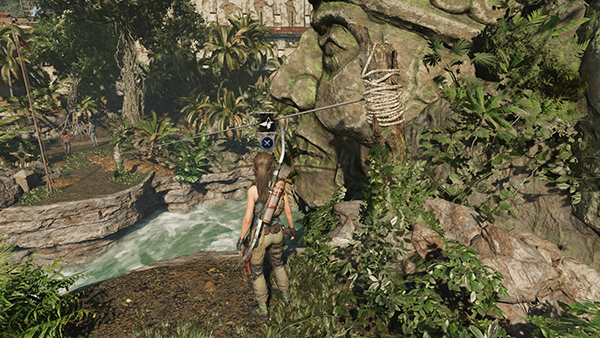 RETURNING TO THE MISSION: In case you didn't notice earlier, this area is also the territory of a condor, which can be seen flying overhead. (Later you'll meet an NPC who tells you about this.) If you like, you can hunt it for its rare feathers. Then head back toward the Mission the way you came. Jump across the gap and follow the path back up to the road. (screenshot) You'll probably need to remake the rope line so you can cross the river in order to get back down to Sara and Guillermo. (screenshot) When you talk to him, he sounds pleased to hear that Isabela is OK and says he'll handle the rescue. He also gives Lara another 500 gold pieces and the next mission objective: Talk to Manu.