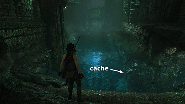 The first cache is in the room with the pool and ledges. Fast travel to the Cozumel Cliffs Base Camp and follow the passageway to the east. The cache is on one of the ledges on the south side of the pool. You can probably spot the flashing light where it's buried. Otherwise, check the walkthrough. (Click screenshot to enlarge.)