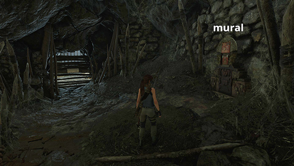 This mural is in Rimak's Crypt. Fast travel to the Plane Fuselage Base Camp then head northwest to the crypt entrance. (Follow the crypt crypt walkthrough if necessary.) The mural is a little way into the tunnel on the right, just before the rope-arrow barrier. To get back to camp, follow the path in this screenshot. Climb the rocks, swing over to the plane fuselage, and slide down. (Click screenshot to enlarge.)