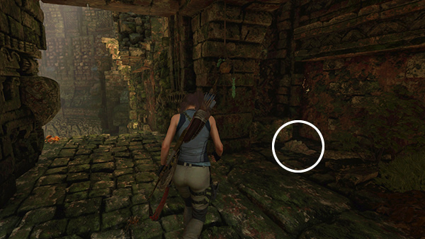 This cache only appears after you've deciphered the monolith, which requires that Lara be Proficient in the Quechua dialect. The monolith is in the drawbridge puzzle area about halfway between the Plane Fuselage and Jungle Ruins Base Camps. See the section for relic #6, above. Deciphering the monolith reveals a clue: "Two serpents guard life and death. I lie trapped within their eternal struggle." Climb the nearby steps to find the cache buried between the two stone serpent heads. Check the main walkthrough for more info. (Click screenshots to enlarge.)