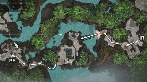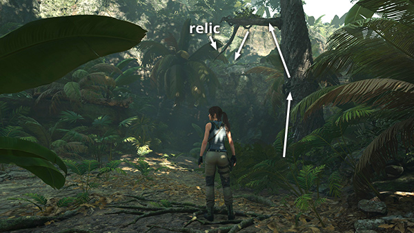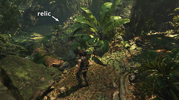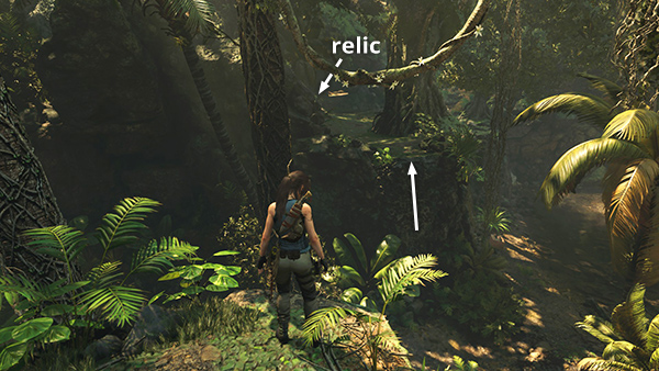 This relic is in the area with the drawbridge puzzle. You can reach it from the Plane Fuselage Base Camp by following the path to the southeast or from the Jungle Ruins Base Camp by heading to the northwest, as indicated by the arrows in this map detail. You'll find the relic at the top of the steps near the monolith. When you're done in this area, return to either camp and fast travel away. (Click screenshots to enlarge.)