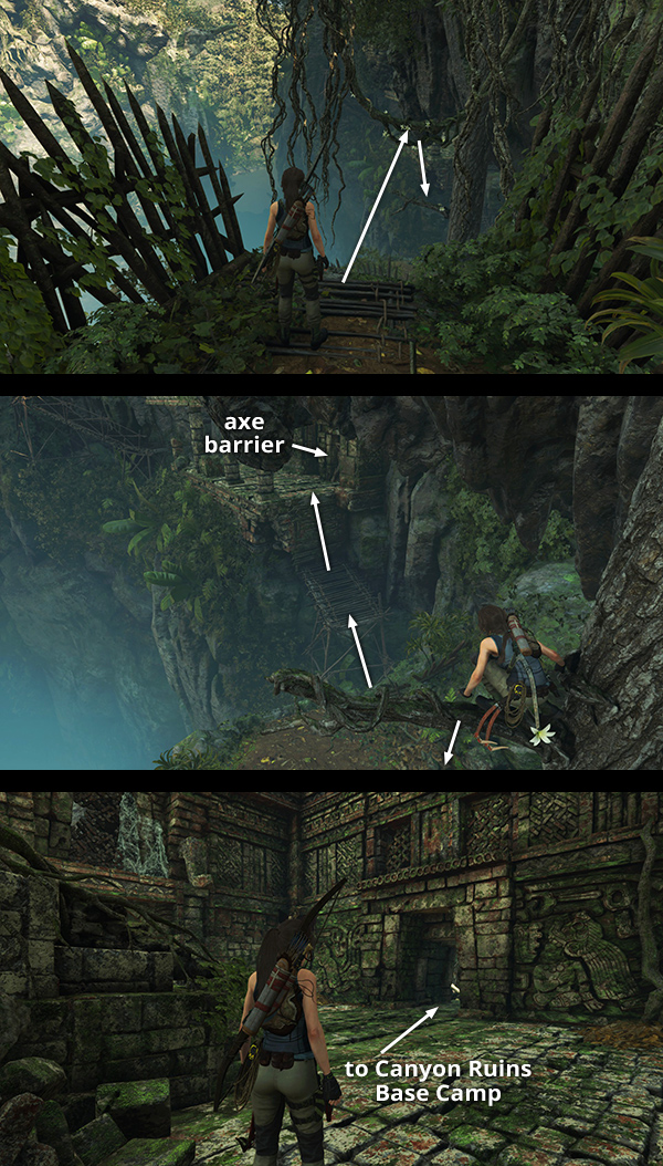 This document is also in the Underworld Gate Challenge Tomb. If you've already explored there, fast travel to the Canyon Ruins Base Camp. Then follow the tomb walkthrough to reach the document, which is just before the fallen tree you must cross to reach the puzzle area. Once you have the document, you don't need to take the circuitous route past the stele to get back to camp. Instead, exit the alcove with the document, turn right, and follow the path shown in these screenshots to get back to the Canyon Ruins camp. (Click screenshot to enlarge.)