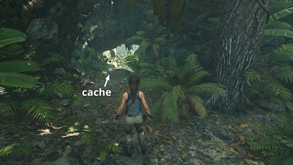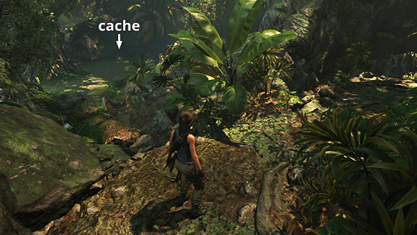 This cache is just outside the entrance to the Crypt of Urqu, The Scout, in the starting area where Lara retrieves her gear after the crash. From the Plane Wreckage Base Camp, head northwest. Climb onto the ledge near the crypt entrance, and you'll find the cache buried a few steps to the left of the tunnel opening. (Click screenshot to enlarge.)