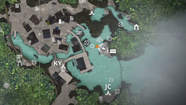 This cache is at the bottom of the pool beyond the temple on the north side of the village. Fast travel to the Kuwaq Yaku Ruins Base Camp and follow the muddy path west to the clearing with the Eagle icon on the in-game map. The temple is here on the right. Go inside and climb the stairs all the way to the top to emerge on the ledge overlooking the pool with the cache. You can't climb back up into the temple, so follow the river northwest to the Docks Base Camp. You can fast travel away from there. (Click image for more and larger screenshots.)