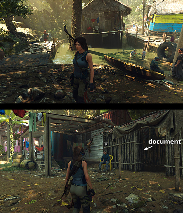 This document is in the northeast corner of the village. From the Kuwaq Yaku Base Camp head for the dock at the north end of the lake. (On the map it looks like it's closer to the Hunting Grounds camp, but it's actually within the village.) There's a shack built from sticks at the end of the row of houses facing the dock. The document is inside. (Click image for more and larger screenshots.)