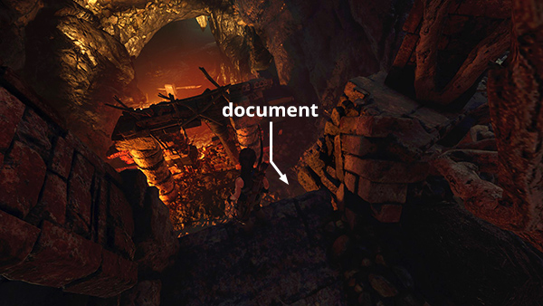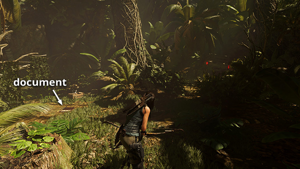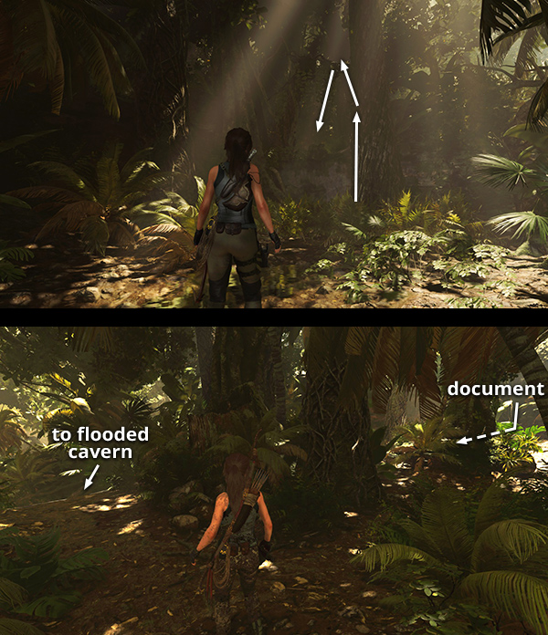 NOTE: If you're coming from the Temple of Light via the flooded cavern with the piranhas, you'll approach these documents from the north instead. Follow the main walkthrough if necessary.