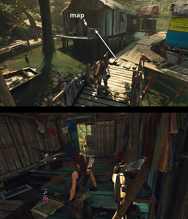 Archivist Maps are also not required for 100% completion, but examining them can help you locate other collectibles. This one is inside one of the shacks built on the docks above the river in the village. Fast travel to the Kuwaq Yaku Base Camp. Then cross the wooden docks to the northernmost house—the one with blue-striped siding. Jump from the dock to grab the cloth-draped railing and climb up to find the map inside. Examining it reveals the following items on your in-game map: relic #4; documents #12, #16, and #18; monolith #1; murals #3, #5, #6, #7, #8, #9, and #10. (Click screenshot to enlarge.)