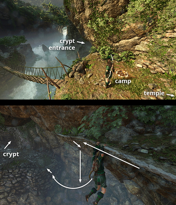 The entrance to this crypt is also in the gorge east of Paititi. Again, follow the main walkthrough to find it during the 'Rebellion Lives' chapter. Later in the game, fast travel to the Temple of Kukulkan Base Camp. Then climb down the cliff wall below the campsite to reach the crypt. The crypt walkthrough has details and additional screenshots. (Click screenshot to enlarge.)