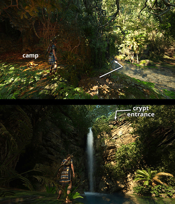 This crypt is located in the jungle west of the city. It's covered in the final Paititi section of the main walkthrough, along with the Path of Battle Challenge Tomb and Hearts and Minds/Champion's Bow Side Mission. If you explored that area but missed the crypt, either enter the Path of Battle area through the tunnel in the lower city (shown in the first screenshot and marked 'Path of Battle Entrance' on the annotated map) or fast travel to the Wild Jungle Base Camp. Follow the stream south to the crypt entrance, which is at the top of the waterfall. Check the crypt walkthrough for details and additional screenshots. (Click screenshot to enlarge.)