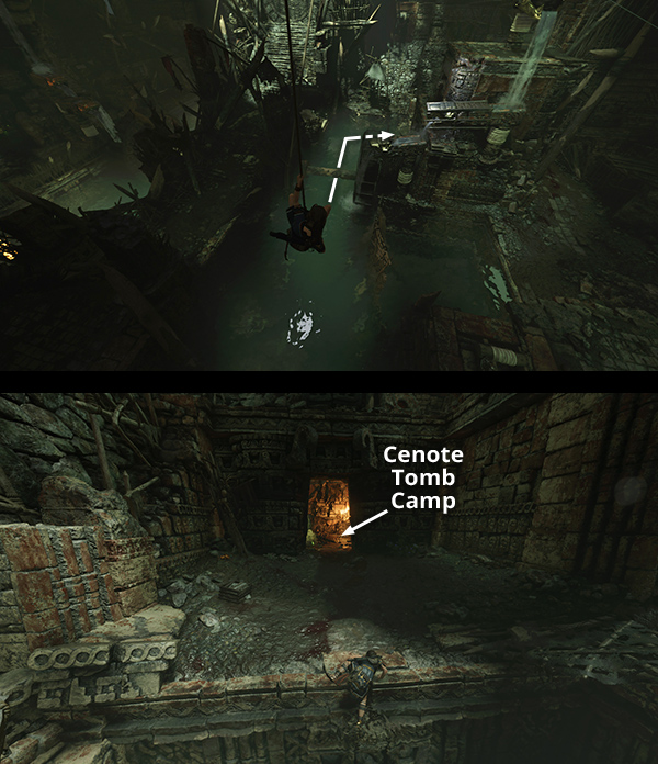 It's not possible to get back to the Cenote Temple Ruins camp from here, so continue along the passageway to the southwest, swim down through the waterwheel and continue to the huge cavern with the round stone gate. Follow the main walkthrough if you need help navigating. Head for the southwest corner of this area to find the Cenote Tomb Base Camp, which only appears after completing this area in the story. Fast travel to wherever you left off. (Click second image for more.)