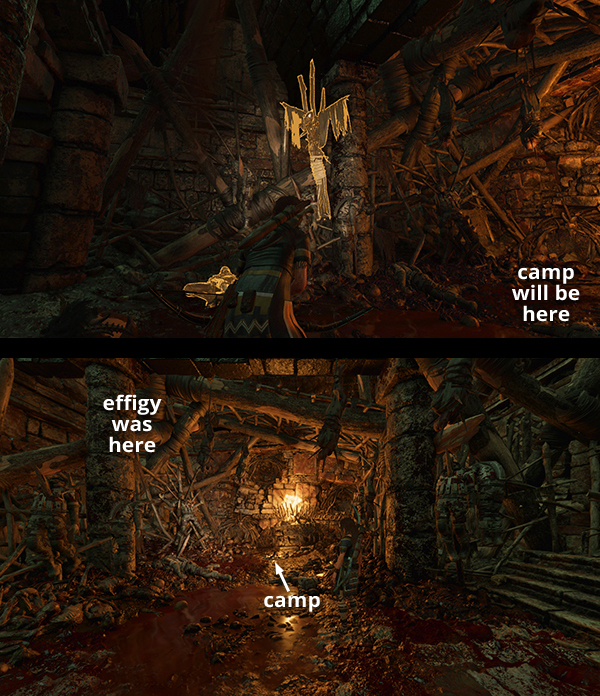 I had already completed the challenge when I revisited this area. The last screenshot shows the effigy in its original place during my first play-through. (Click image to enlarge.) Like the others, it's also marked with a red dot on the annotated map. If that's all you need here, return to the campfire and fast travel away.