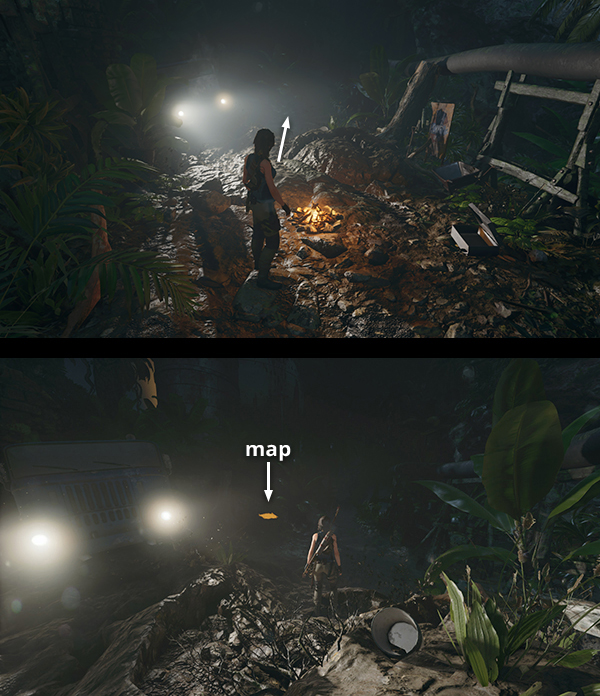 Archivist Maps are not required for 100% completion, but they're useful for locating other collectibles. If you missed this one, fast travel to the Destroyed Bridge Base Camp, which appears once you've cleared the level. Follow the path to the north and you'll find the map sitting on an oil barrel just beyond the truck with its headlights on. Examining it reveals the locations of the relic, mural, and all documents in this level. (Click image for more and larger screenshots.)