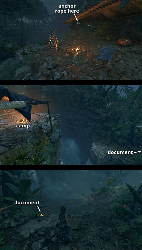 This document is in the canyon below the first base camp. If you missed it, fast travel to The Beach Base Camp. Move to the southwest side of the ledge and use a rope arrow to run a line down across the canyon. Slide down and follow the path to the south. You'll find the document on the ground on the left side of the path, just before the shallow pool. Climb back up the rope line to the base camp and fast travel away. (Click image for more and larger screenshots.)
