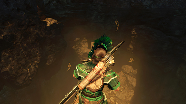 Move through the low, dark tunnel. Then continue forward through a sunlit doorway. Loot the ceramic jar on the left to get some random resources. Then move out onto the ledge overlooking a deep cavern. Jump over to the climbable wall. Then rappel down to the cavern floor. Follow the passageway to the south. Don't worry; there are no traps or hazards. Squeeze through a doorway that's been partially blocked by dripping limestone. In the next room, use a rope arrow to pull down the wooden barrier blocking the exit. Continue along the dark passageway, through an area where you have to wade through shallow water and scattered bones then up a flight of stone steps, through another narrow opening, and up another flight of steps. (screenshots)