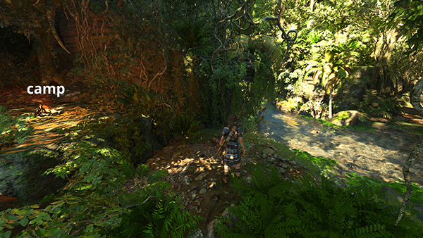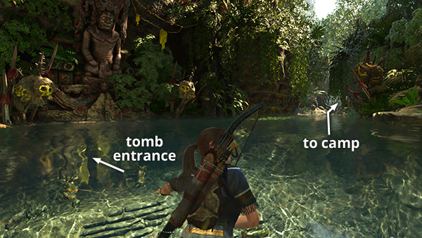 The entrance to the PATH OF BATTLE CHALLENGE TOMB is on the left (west) side of the pool. Or, if you're ready to move on, swim to the north end of the pool, wade forward through the shallow water, and you'll find the Wild Jungle Base Camp just ahead on the right. (screenshot)