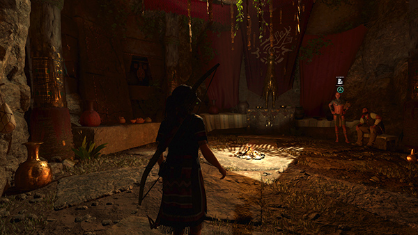 When this mission is first introduced, the mission giver, Uchu, can be found with Jonah near the Unuratu's Home Base Camp. (screenshot) Later in the game, they will both move to the SKULL CAVE, so you may accept the mission there. This will be covered in the HIDDEN CITY REVISIT WALKTHROUGH. Uchu tells Lara that he's sent three of his best scouts to retrieve three sacred items for Etzli's coronation: the King's Horn, the Savior's Amulet, and the Champion's Bow. Uchu already has men going after the Amulet and Bow, so Lara offers to help Retreive the King's Horn from the instrument maker, Kabil. The goal is to Speak with Kabil, but Uchu suggests she might also approach Kabil's wife, Abra, since she has a mellowing influence on her cranky husband.
