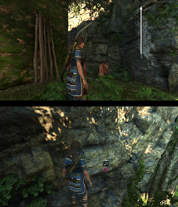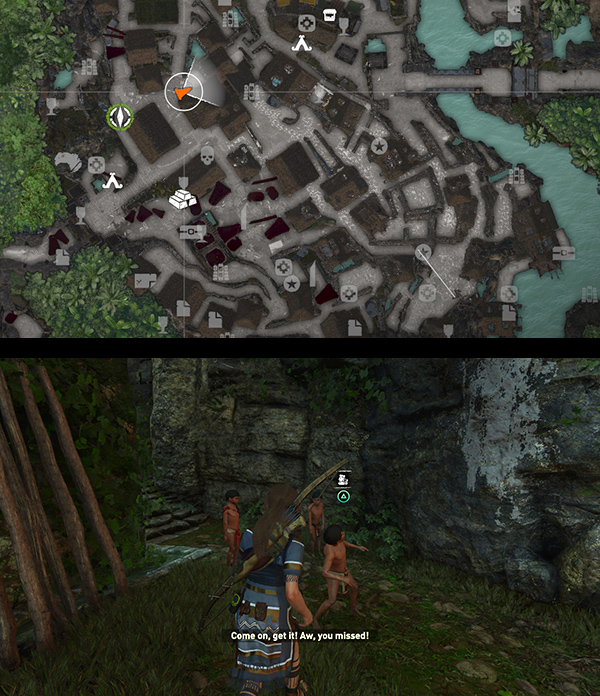 Your next goal is to Talk to Yamil, whose location, just a short distance to the west, is marked on your map. When you find him, he's standing near the base of a high ledge with some other boys. (screenshots) He tells Lara that he took his father's ceremonial knife to show his friends. Chimalli, the guard, found out and threw the knife up onto the ledge so the boys couldn't reach it. Lara offers to Retrieve the Knife. It's also marked on your map, but you don't need to go far. The ledge is right where the boys are standing. Scramble up and get the knife. (screenshots) Drop down and Return the Knife to Yamil.