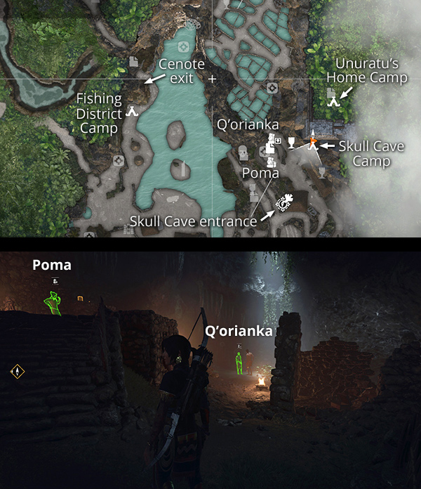 THE AGE MAKERS SIDE MISSION: To start the mission, you must have completed the CENOTE level in the main story. Then use the network of base camps to Fast Travel to the Skull Cave Camp in THE HIDDEN CITY. (If you haven't reached that location yet in the main story, just keep playing until you do.) When you arrive, the mission giver, Q'orianka, should be marked on your map. She's the bald woman arguing with a male warrior on the north side of the cave. Like other NPCs involved in missions, she'll glow green in Survival Instinct. Poma, the mission giver for the Freedom Side Mission can also be found here. (screenshots)