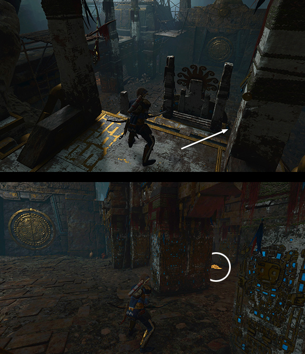 FIGHTING THE CULT GUARDS: There are 10 cultists in the courtyard below, a mix of Jaguar Warriors (brown uniforms and obsidian blades), Eagle Archers (blue), and a few Serpent Guards (green). If you attempt to shoot any of them from the doorway without first dropping down, more cultists will spawn in the the upper room and attack Lara. So stealth is probably your best bet, at least to start. As always, there are various possible tactics, depending on your play style, which skills, weapons, and ammo types you've unlocked so far, etc. You'll find many vine-covered walls where Lara can hide, ledges and walls she can use for cover and traversal, jars to use for crafting smoke bombs, etc. You also have all of your equipped weapons, not just the bow. However, there's a more challenging fight against some Trinity soldiers coming up, so take out as many cultists as you can with stealth and/or arrows. Then you'll have more ammunition later. Here's one possible battle plan, which should work even if you're playing this DLC soon after reaching upper Paititi.
