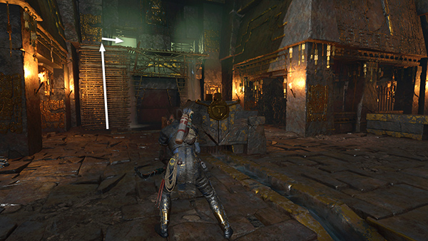 When you've killed the last enemy, Lara says, "There's a way in somewhere." She doesn't relax her defensive posture, but you're free to explore the courtyard, search the cultists' bodies, and gather supplies, craft arrows and/or special ammo, and get ready for another fight. Then head for the south end of the courtyard and climb the wooden slats to the ledge above the closed door. Sneak through the rectangular opening into the next room. (screenshot)
