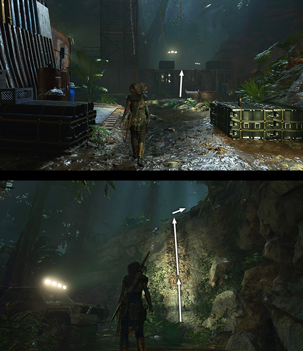 Run behind the storage shed on the left as 3 more enemies arrive. There are several vine-covered walls here: one on the west cavern wall, one on the north side of the storage shed, and another on the cavern wall opposite. If you run around the corner and hide in the vines on the back of the shed, you can spot approaching enemies from either side. Heal and top up your Endurance meds as you wait for the next few enemies to come to you. Then use stealth attacks to take them out one at a time. If Lara is spotted, switch to the shotgun or rifle and blast away. Or, if one of the Jaguar Warriors attacks, wait for him to lunge at you with his obsidian-edged blade, and use the Puma's Feint for an instant kill. (Again, check the Cenote walkthrough for details if you've unlocked the skill but haven't practiced it yet.) (screenshots)