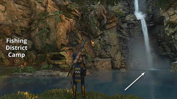 When you're ready to tackle the Path of Huracan, exit SKULL CAVE and head for the waterfall at the north end of the river, just beyond the Fishing District Base Camp. (screenshot) While you're here, check to see if the jade deposit below the falls has respawned. Then climb out onto the ledge and scale the climbing wall on the left. The CHALLENGE TOMB ENTRANCE is on the ledge above. (screenshot)