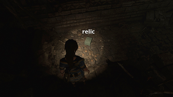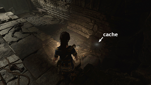 ENTERING THE TOMB: Scramble up onto the ledge, enter the dark passageway, and squeeze through the narrow opening ahead. Just inside, look for a buried survival cache (5/8) below the walkway on the right (screenshot) and a relic (3/5) Primitive Doll (Mam/Handmade Dolls) below on the left. (screenshot) Gather some salvage, black powder, and cloth.