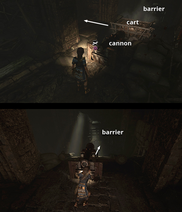 To get through the wooden barrier to the southeast, you'll need to move the mine cart and cannon blocking the way. Start by pushing the cart off to the left to clear a path. Then push the cannon down the slope to smash through the barrier. (screenshots)