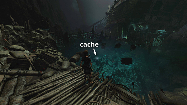 HUGE CAVERN WITH TRAPPED GALLEON: It wouldn't be a 21st-century Tomb Raider game without some kind of shipwreck, am I right? No matter, it still makes for a fun puzzle. Before attempting to board the ship, dive into the pool and swim down on the left side to find another survival cache (6/8). (screenshot) One of the relics that was revealed on your map when you found the archivist map earlier is also in this pool, but it's behind a wall of debris, so you can't reach it from this side. We'll get to it soon.