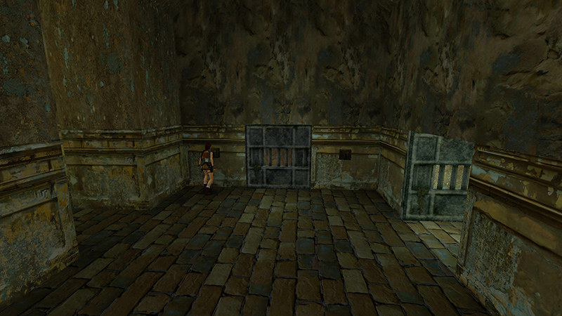 LEVEL ENTRANCE: Lara falls into this flooded passageway from the final area of The Cistern. Swim down and forward through a long, straight tunnel. As you approach the ornate metal grate at the end, ignore the room above for now. You won't find air there yet. Swim down past the grate. At the bottom, make a U-turn and swim forward to a lever. Pull it to lower the water level, roll to face away from the lever, and swim back up, past the grate to the surface. Climb out on the ledge and use the switch to open the door down the hallway to the right. (screenshots)