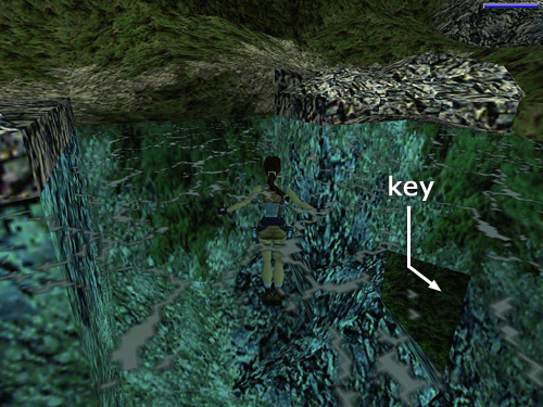 Continue toward the second building. When you come to the crumbling area in the middle of the wall, slide down into the pool below. You'll find the GUARDHOUSE KEY (2) in a small underwater cave. It's on the right if you're facing away from the wall. (screenshot) Swim into the tunnel, position Lara above the key and press Action to pick it up.