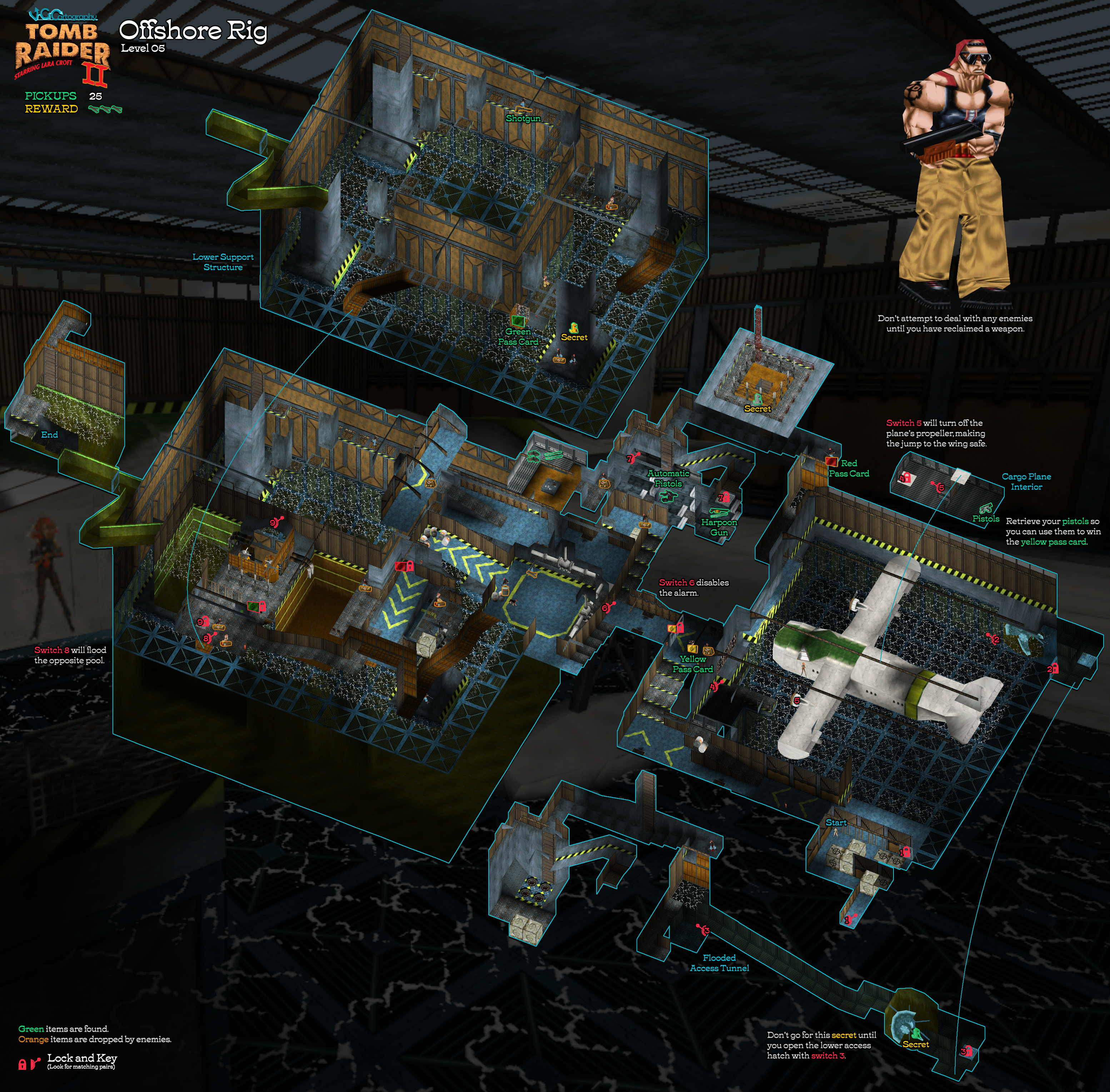 Secrets: 3 Pickups: 31, including pistols, automatic pistols, harpoon gun, shotgun, Uzis, 3 pass cards, and 3 secrets Kills: 20