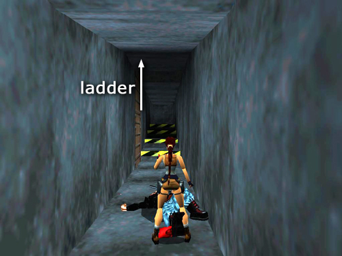 NOTE: Save frequently during this next sequence since it's easy to miss a jump or accidentally step off a ledge. If you fall into the pool and don't want to reload, there's a ladder in the far left corner (relative to the long chute where you came in). Swim over there, climb out of the water onto the cement footing and jump to grab the ladder. (screenshot) Climb back up to the catwalks and continue.