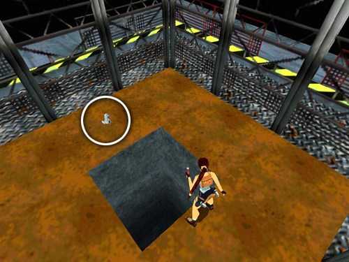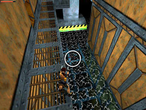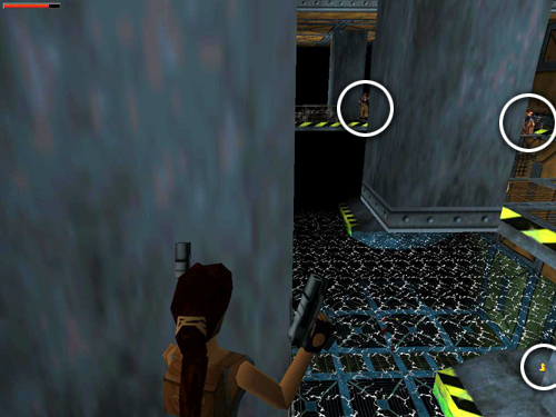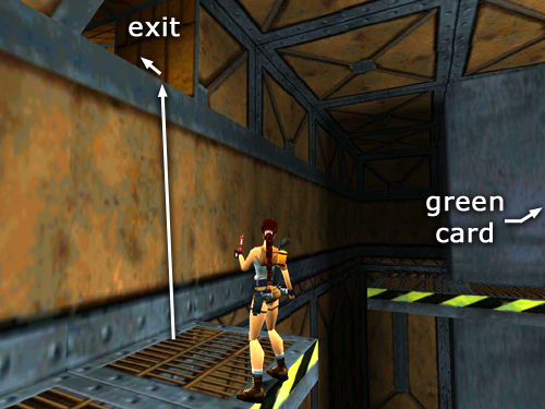 GREEN PASS CARD: Turn so the walkway with that last enemy is on Lara's right. Take a running jump to the catwalk against the wall. Note the opening above. You'll be exiting here later. Move to the other end of this walkway and take a running jump onto the ledge ahead. Carefully line up the next running jump to the catwalk where the last bad guy fell. Tap Left while Lara is in the air to veer in that direction. This enemy has no goodies, but you'll find the GREEN PASS CARD (25) in a cabinet. Shoot out the glass and take it. (Again, check the screenshots to get oriented.)