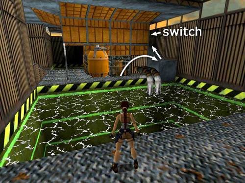 Go back the way you came to the ROOM WITH THE RAMP AND METAL LEDGES. Safety drop into the room. Then climb onto the ledge and swim across the pool to the area with the big orange tanks. Jump over the pipes on the right to land on the metal ledge near the wall. Jump up the slope and pull the switch to open a concealed trapdoor in the room with the GREEN LOCK. (screenshot)