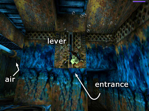 FLOODED BURNER ROOM: Now that it's underwater, you can reach the lever just inside on the right (i.e., above and to the left of the entrance if you turn around to face it). (screenshot) If you need air, head for the opening in the ceiling of the little room to the left of the lever (i.e., above the switch you pulled to turn off the burners). Fill Lara's air meter then swim back into the burner room and straight across to the door you just opened. Otherwise, immediately after pulling the lever, roll and swim through the door and down through an opening in the floor.