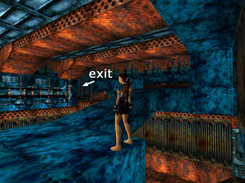 Lara can safety drop to the floor from this ledge if she has full health. To get down without injury, take a running jump to the fourth piston, which is now lower than it was before. Then safety drop to the angled surface below and slide down to the floor. Follow the rusty passageway back toward the BURNER ROOM. The part of the passageway where you killed the bad guys before is now flooded. Hop into the water and swim into the room.