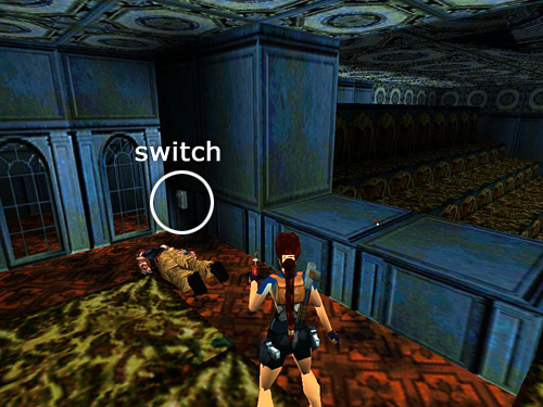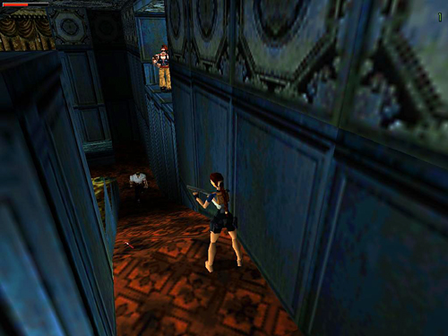 THEATRE LOBBY: Enter this garishly decorated room and kill the goon with the gun (12) on the landing to your right. Head up the ramp to the next room, and take out another armed baddie (12) in the black-and-white tiled area below and to the left. (screenshot) Don't go over the railing yet. First head for the back of the red-carpeted area with the gold sofas and pull the movable box to open up a hallway on the other side of the box. (screenshot)