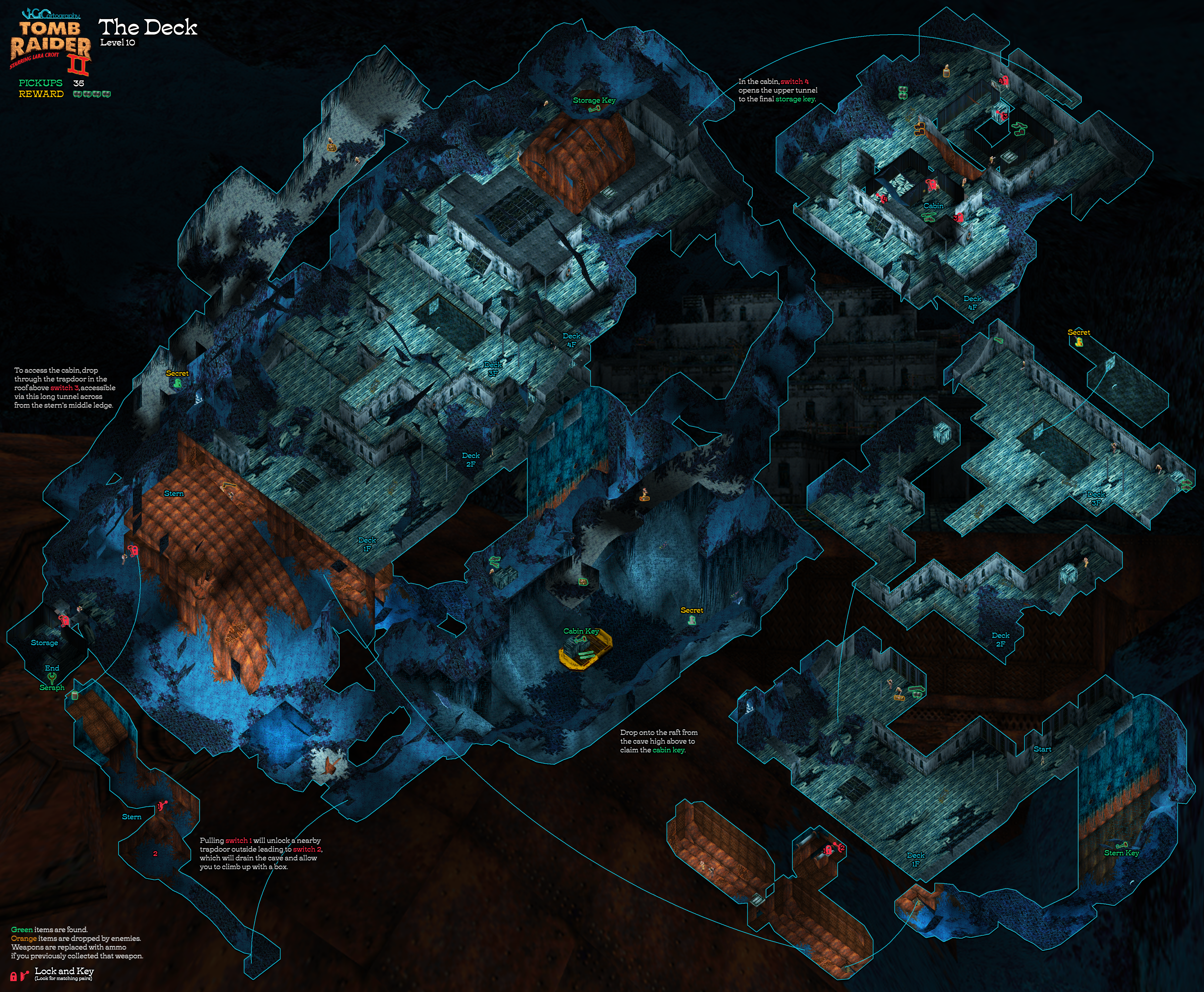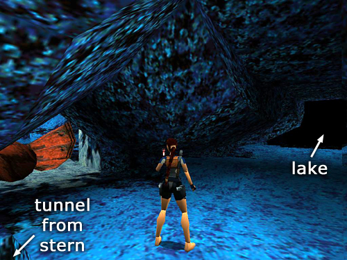 OBJECTIVES: This is another large, complicated level. You begin on the main deck of the ship, which has somehow come to rest in a huge, undersea cavern. Climb down into the cave alongside the deck to find the Stern Key. Swim through a flooded passageway to the cavern floor. Use the key to reach an underground lake, where you'll find the Cabin Key. Make your way back to the upper decks and use this key to open a door there. Then locate a hidden cave, where you'll find the Storage Key. Climb all the way back down to the cavern floor and use this key to obtain the Seraph artifact. Doing so ends the level.