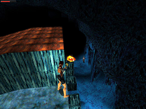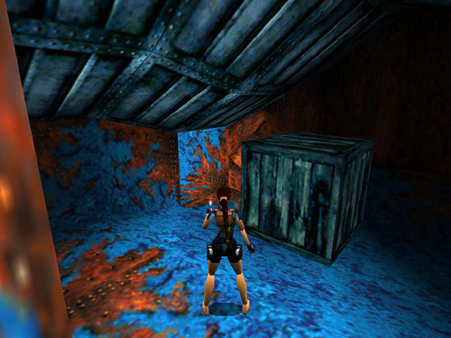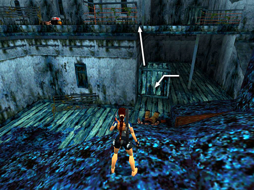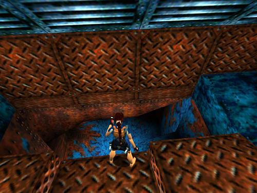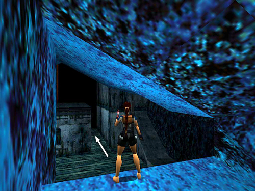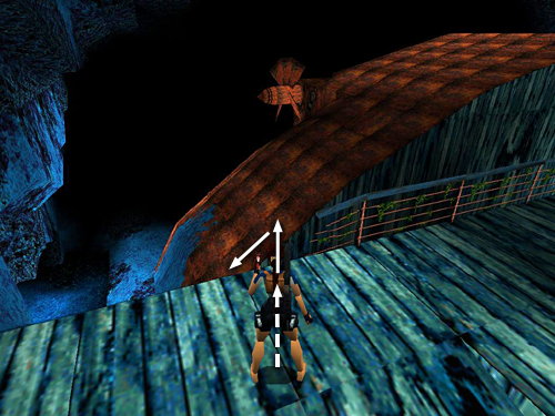 NOTE: In the PS1 version, attempting to safety drop off the edge results in Lara getting skewered on the broken glass. So you'll need to walk to the edge and jump forward instead. Lara will take a small amount of damage from the glass, but she'll survive.
