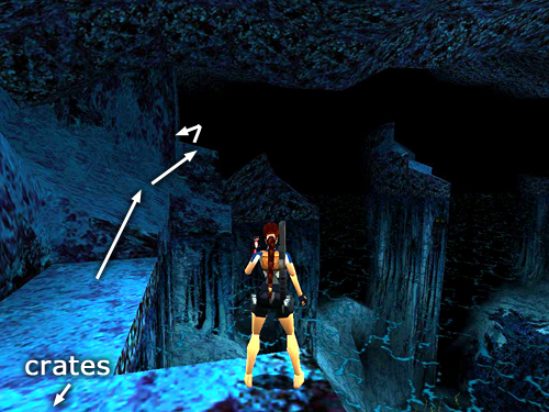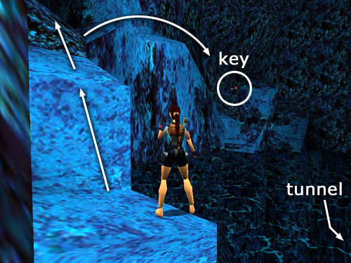 There's a key sitting atop one of the crates on the raft, but unfortunately you can't climb into the raft from the water. So you'll need to make your way to the cavern exit at other end of the lake. First, stop off for a secret: From the ledge with the crates, facing the raft, turn left and swim forward until you come to a tall rock formation sticking out of the water. On the bottom of the lake just below this rock formation there's something shiny amid the seaweed. Dive down to find SECRET #1, the Silver Dragon (9). (screenshots)