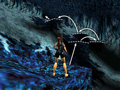 CAVE WITH STEPPED BLOCKS: Follow the passage to a large cave where you can jump from one flat block to another to hop up the steep slope. (screenshot) Take care of the 2 bad guys with wrenches (24-25) at the top. If necessary, slide back down to the bottom and shoot them as they approach. One drops a large medi pack (22).