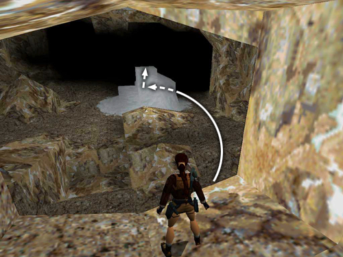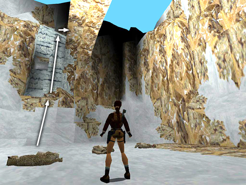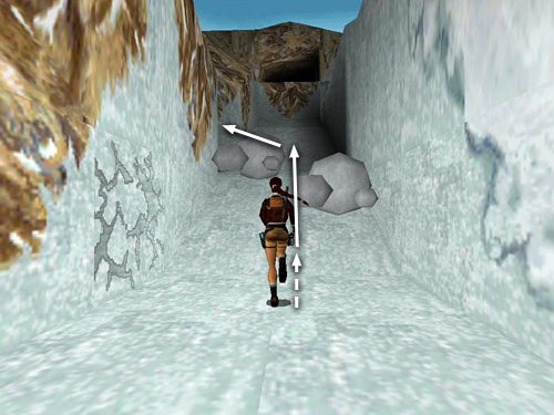 First, the shortcut: Move the snowmobile into position facing the ramp in the middle of the clearing. The tunnel and the smaller opening where you just climbed up to move the ice blocks will be on Lara's left. Save the game here. Then if you miss the first jump, you can just reload and try again. Ride up the ramp diagonally so you take off at the top right corner. (I found it easier not to use the turbo boost for this jump.) Steer just a little to the right while in the air to land on the jagged ledge facing the right cave wall. Then drive forward into the wall to avoid slipping off the other side of the ledge into the trench. Once you've landed safely, save again. Carefully turn the snowmobile around so it's facing the tunnel opening. Race forward along the jagged ledge, holding Action for a speed boost to clear the gap in the ledge, race up the ramp at the end and sail into the tunnel opening. (These screenshots show the whole sequence.)